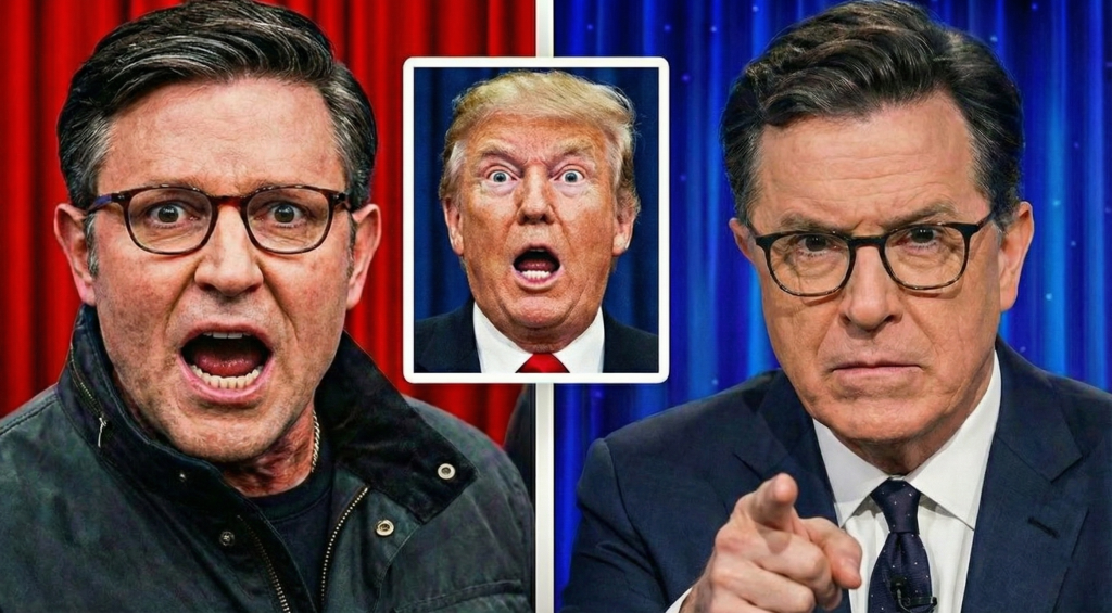 What followed was not a punchline-driven monologue, nor the familiar rhythm of partisan ribbing that has become standard fare in American late-night television. Instead, Colbert delivered something closer to a prosecutorial brief: a tightly structured, deliberately paced segment that traced the rhetorical and political alignment between Mike Johnson and Donald Trump, using their own words as evidence.